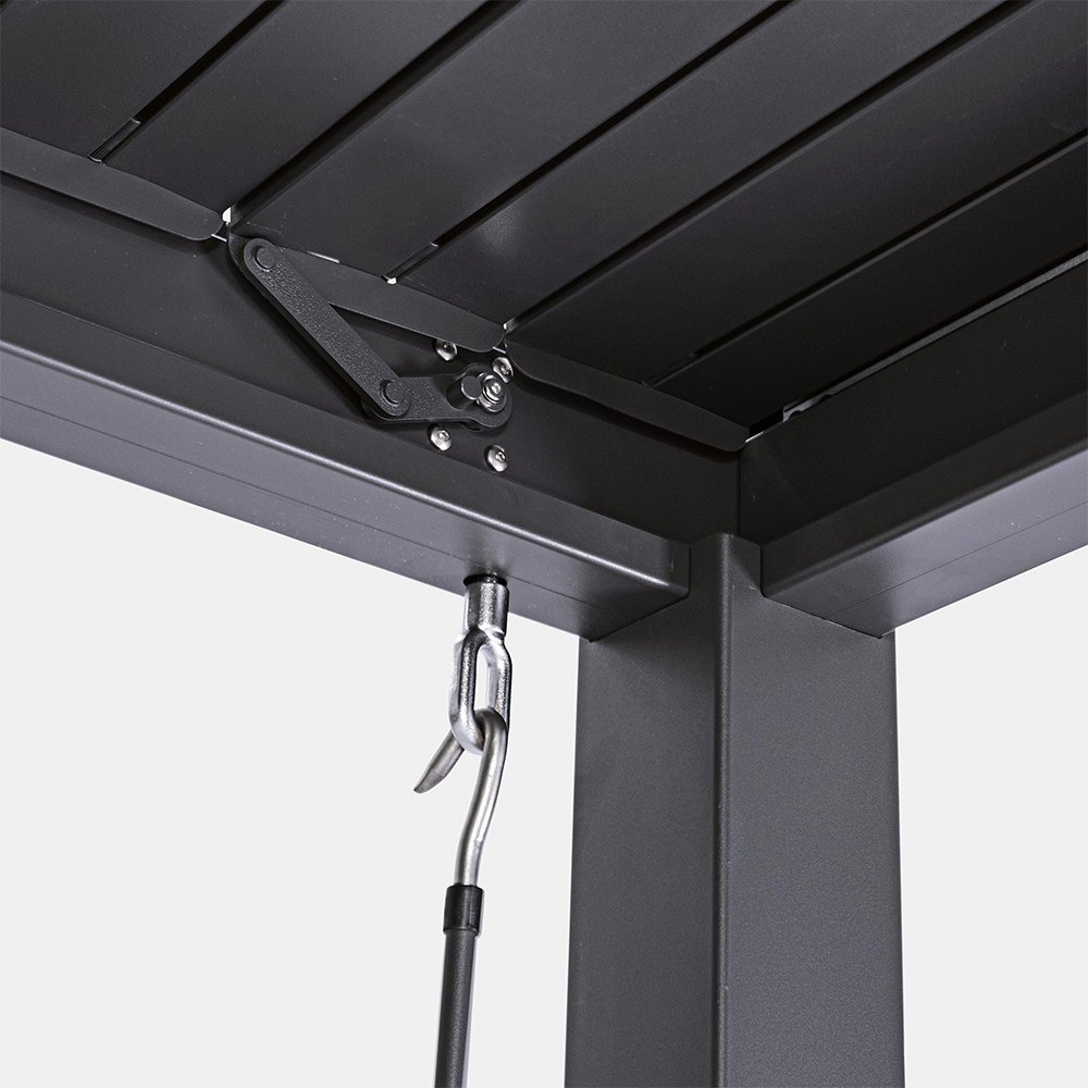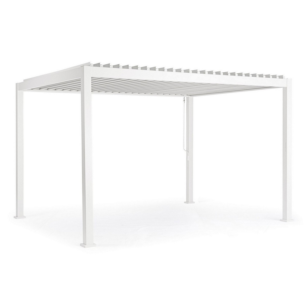 Pergola bioclimatica con copertura in lamelle di alluminio orientabili manualmente tramite apposita manovella.