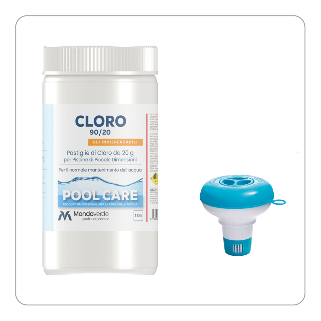 Retino e Aspiratore che funziona con il principio Venturi e può essere facilmente collegato al tubo da giardino. - Dispenser galleggiante e 1 KG di Pastiglie di Cloro da 20 g a Lento Rilascio