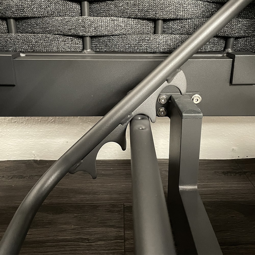 La cuscineria imbottita è rivestita in tessuto per esterno sfoderabile, i lacci in velcro la mantengo salda al salotto..