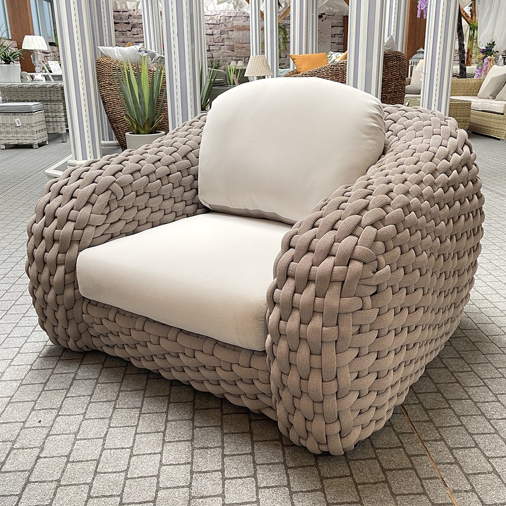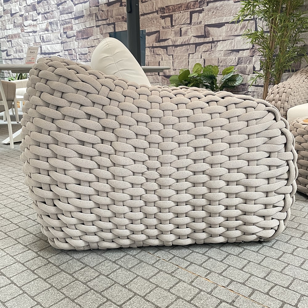 La spessa corda lavorata in un intreccio semplice rende il salotto ancora più moderno e alla moda ingrossando ulteriormente la struttura senza danneggiarne l’eleganza.