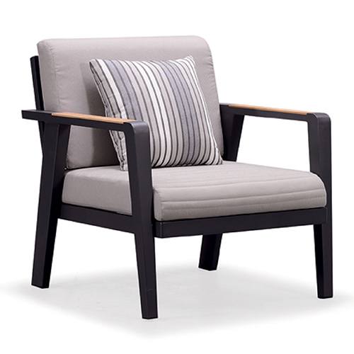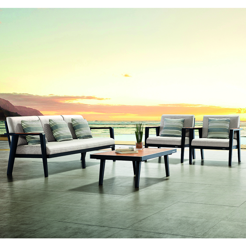 Il profilo in alluminio sagomato e i cuscini ergonomici, uniti al legno teak, danno all’intera collezione un tocco di pura eleganza rendendola ideale sia per un uso esterno che interno alla casa.