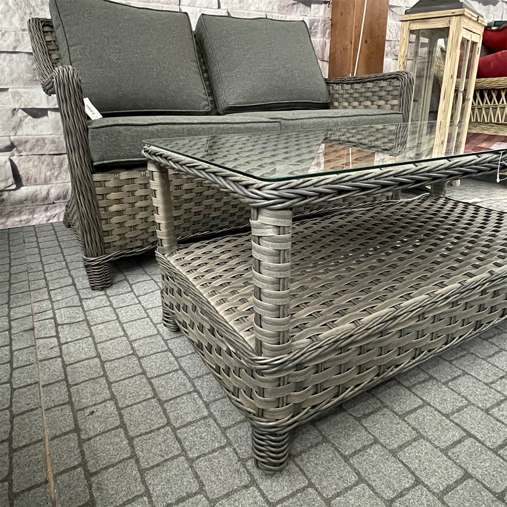 Il tavolino offre due ripiani per il massimo dello spazio, quello inferiore in Ecorattan intrecciato e l’altro con un ulteriore vetro a protezione.