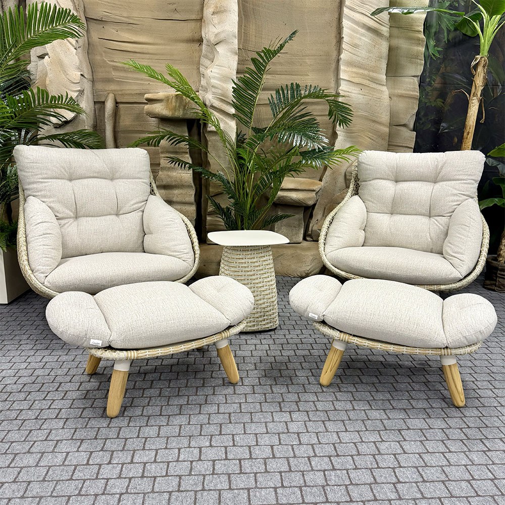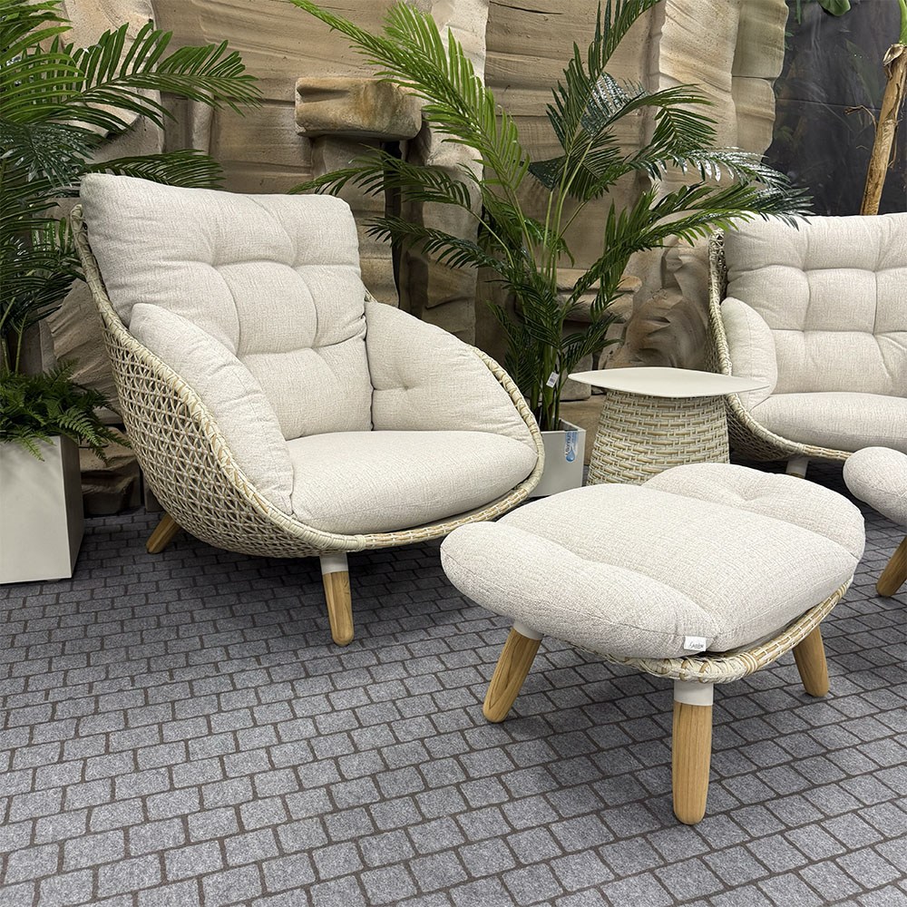 La struttura di poltrone e poggiapiedi è realizzata in alluminio sorretto da Intreccio Dedon Inspired, un particolare intreccio artigianale realizzato a mano con fibre di alta qualità, che non solo dona leggerezza ottica alla struttura ma le conferisce un perfetto equilibrio tra Comfort e durata.