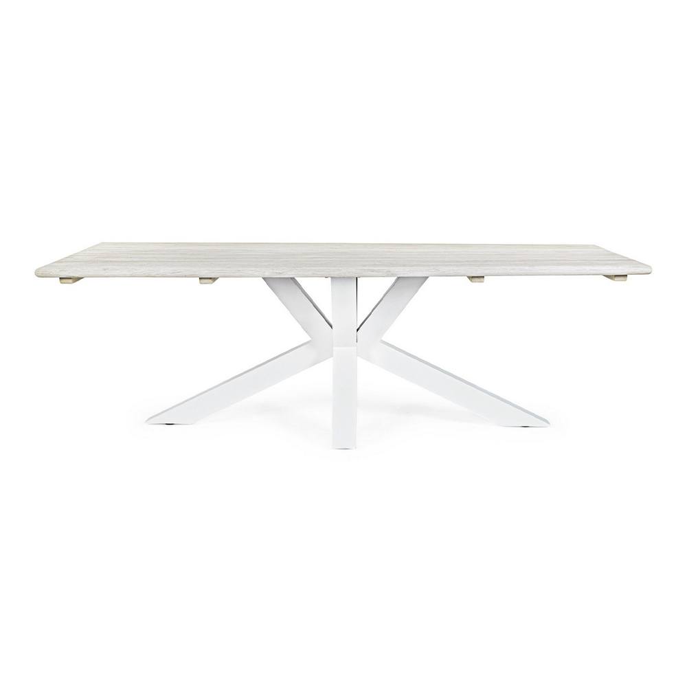 Tavolo rettangolare Itaca con piedi in alluminio bianco e top in legno di Teak indonesiano sbiancato.